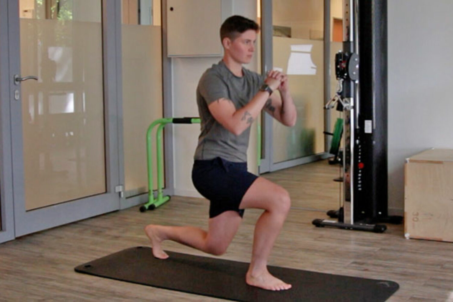 Bei diesem Fehlerbild beobachten wir immer wieder, dass das hintere Bein nicht genügend angewinkelt wird. Hierdurch wird der Ausfallschritt eher „nach vorne unten“ durchgeführt, was langfristig das vordere Knie stärker belastet, weil in der Position ein höherer Anpressdruck der Kniescheibe auf das Kniegelenk erzeugt wird.