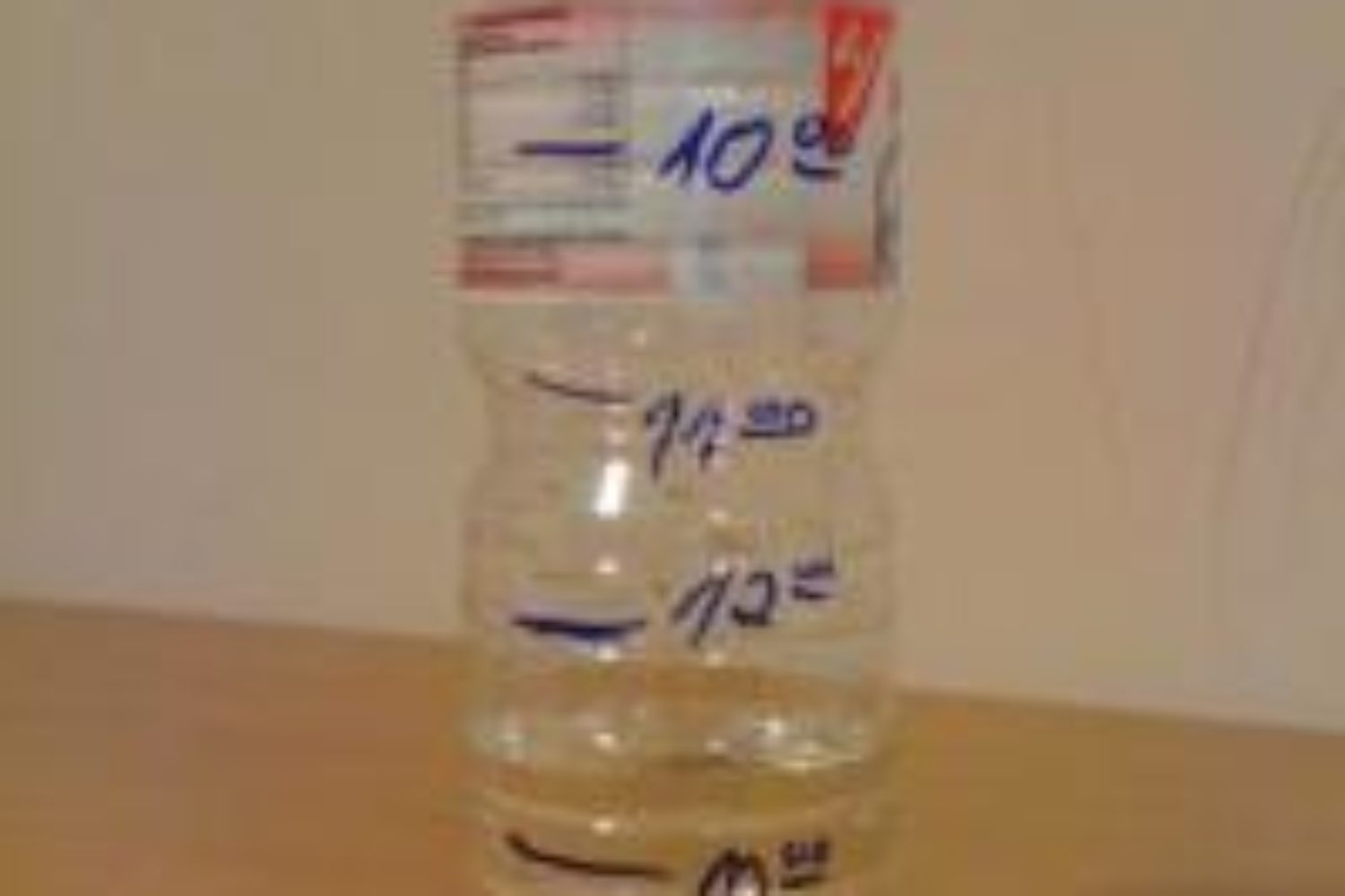 Ich empfehle Ihnen, Markierungen auf Ihrer Trinkflasche zu machen (siehe Foto). Versuchen Sie immer im „Zeitplan“ zu bleiben. Wenn Sie mal hinter der Zeit sind, dann trinken Sie alles aus, bis Sie wieder im Zeitplan sind.