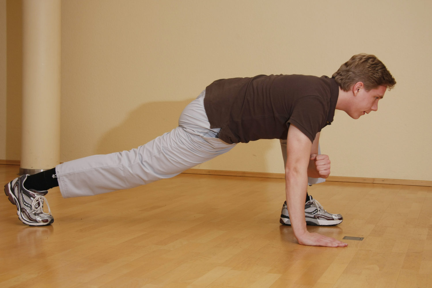 Aus der Startposition (hier linker Fuß vorne) wird das rechte Bein (hinten) gestreckt und der Oberkörper gerade ausgerichtet, Blick nach vorne-unten. Der linke Ellenbogen wird in die Innenseite des linken Knie gestützt. Danach zurück in die Ausgangsposition und Füße wechseln. Dies darf eine flüssige Bewegung werden. Ca. 20 Wiederholungen (beide Seiten zusammen).
