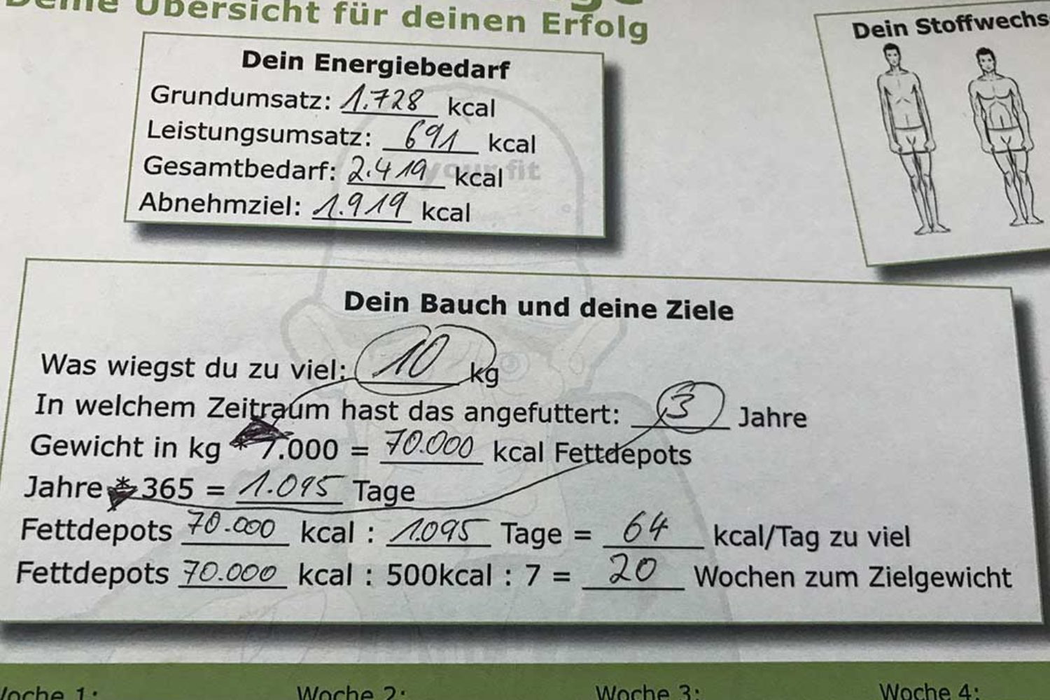 Beispiel: 2.419 kcal – 1.728 kcal = 691 kcal